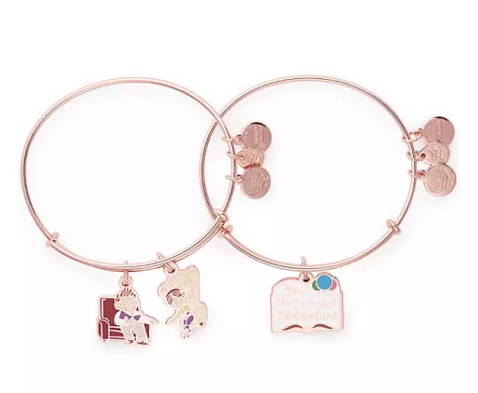 Update your look with this adjustable metal bangle set by Alex and Ani. The enamel Carl and Ellie charms of one bangle reach for each other’s hands while the second bangle features a book opened to the words ”you are my greatest adventure.”