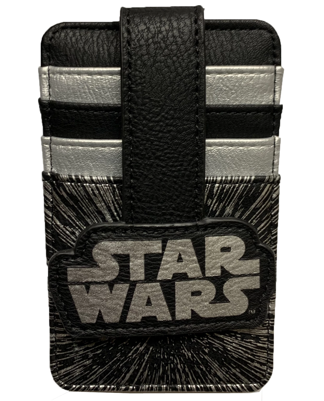 This Star Wars design makes this stacked credit card holder one that will brighten every day. Fashioned in faux leather, it features a snap with Star Wars Logo to keep your cards safe, plus window ID holder.
