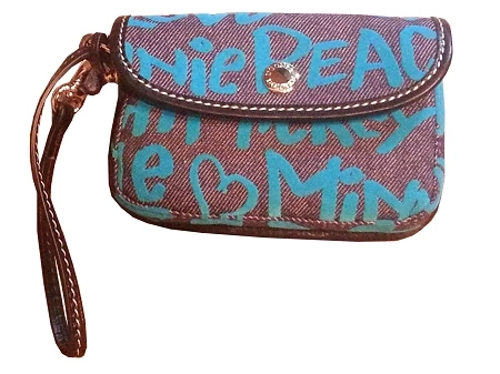 features a Soft Blue Peace, Love Mickey print, on a blue denim. This fine fashion bag ties