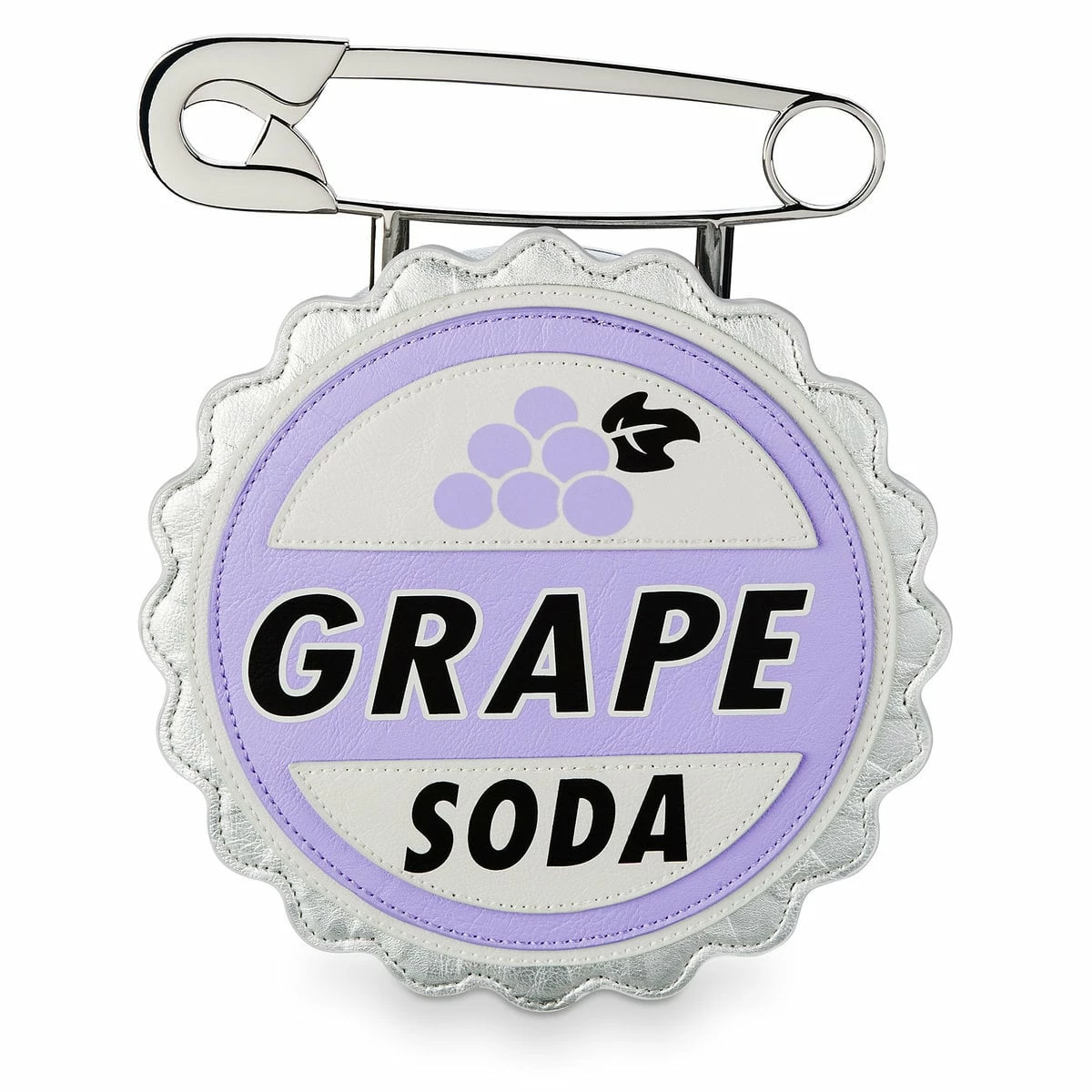 Raise your style game with our Up-inspired handbag. Ellie’s grape soda badge for Carl makes a sweet, chic accent to any look with its die-cut shape, grape screen art, and a gleaming metal safety pin handle.