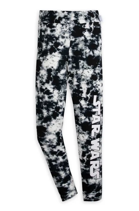 The Star Wars logo and Millennium Falcon icons are spotlighted amid a ”cloud wash” tie-dye print pattern on these stretch leggings from a galaxy far, far away.