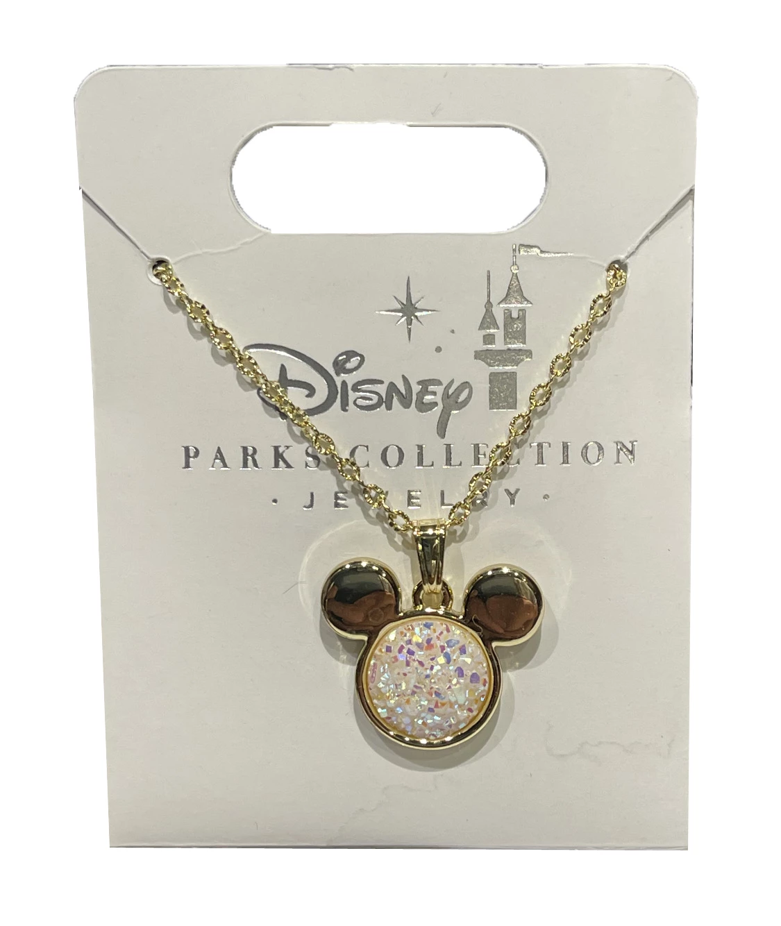 This Beautiful Mickey Icon Necklace Features Mickey Mouse with a White sparkled stone in the center , on a gold linked chain.