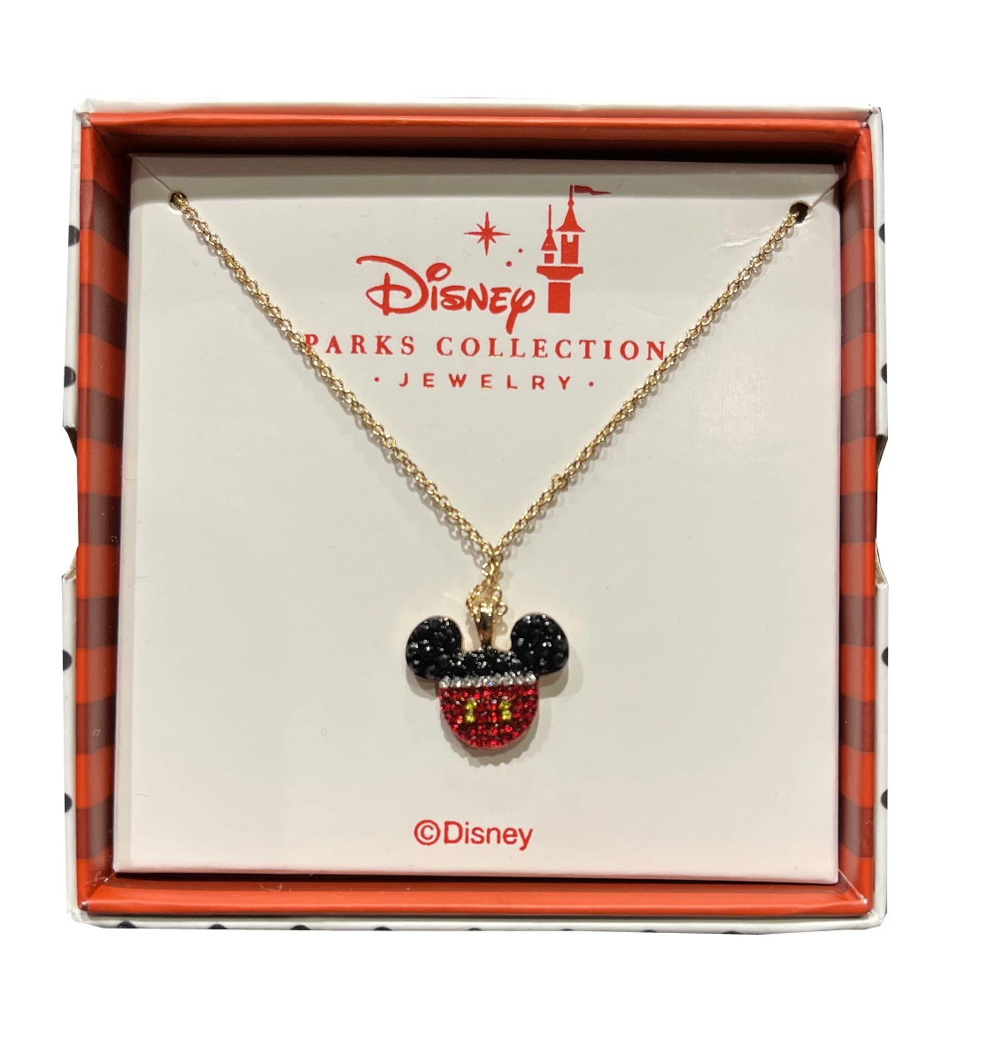 This sparkling Mickey Mouse Icon is covered in red black and White stones with a gold chain.