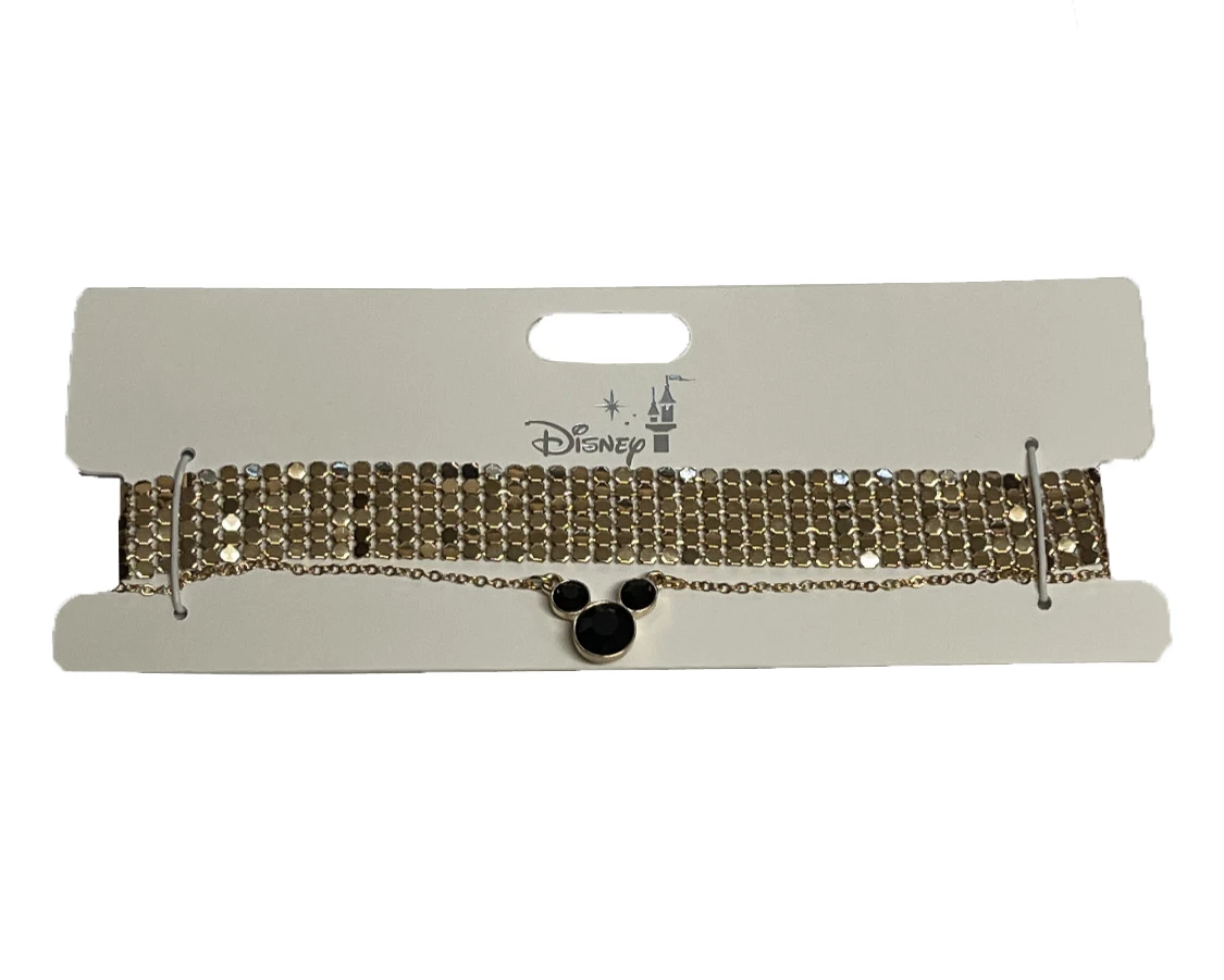 This set of 2 Necklace Features a elegant gold Choker style necklace, and a Black Gem Mickey Icon Necklace with a gold chain linked chain.