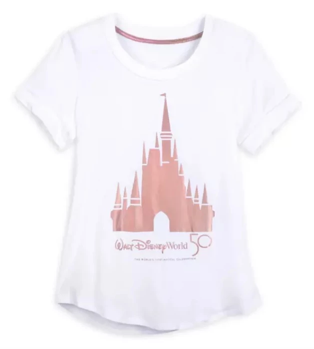 Attend The World’s Most Magical Celebration wherever you are in this elegant scoop neck fluttery fashion tee from Walt Disney World with glittering, golden style and Cinderella Castle icon!