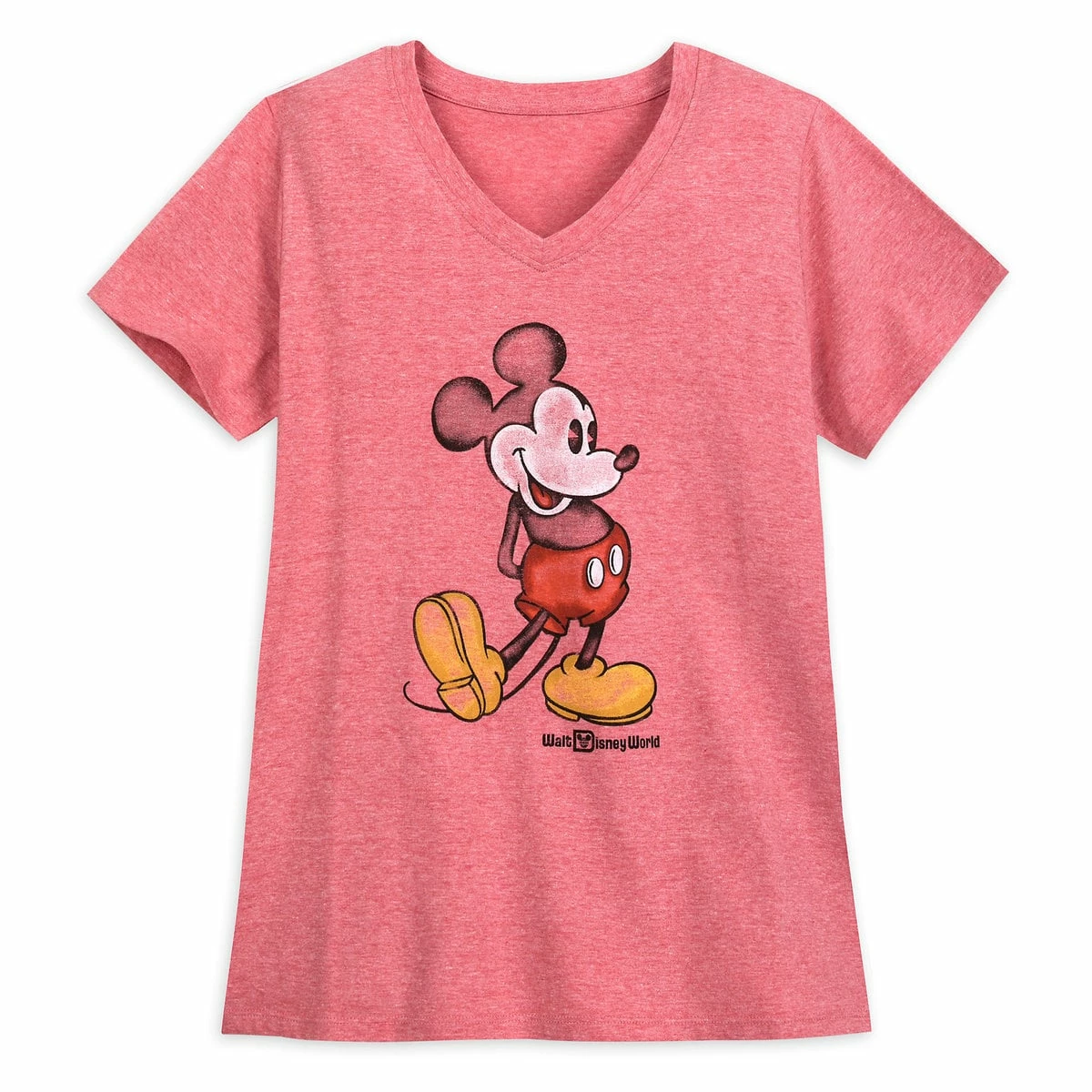 Show off your E-Ticket style as you parade around Walt Disney World in this heathered red t-shirt. Featuring screen art of Mickey paired with v-neck styling, this tee is a timeless treasure from your trip down Main Street!