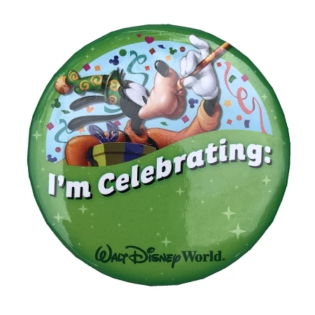 This Disney Souvenir Button has Goofy on it, and Says “I’m Celebrating!” Let Everyone know Your Celebrating with this adorable button!
