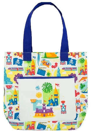 This specious tote bag feature Disney parks Icons in and colorful pattern, with Castle artwork on the front pocket.