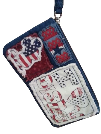 features Mickey Mouse in Red, White and Blue, and a I Love Disney patch with the American flag covering the back on a blue denim. This fine fashion bag ties