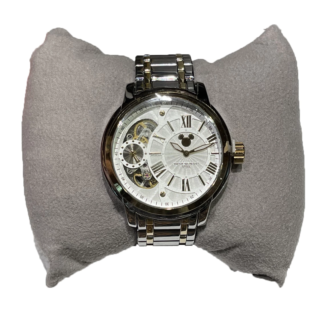Always be prepared to gear up with our durable stainless steel watch direct from the Disney Parks. The watch features automatic movement as well as a subtle Mickey Mouse icon on the watch face in stainless steel and gold.