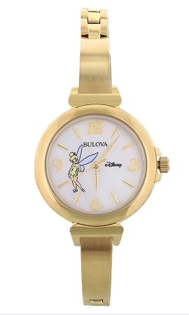 It’s Tinker Bell’s time to shine with this elegant bangle watch. Crafted in gold design by renowned watchmakers Bulova, this