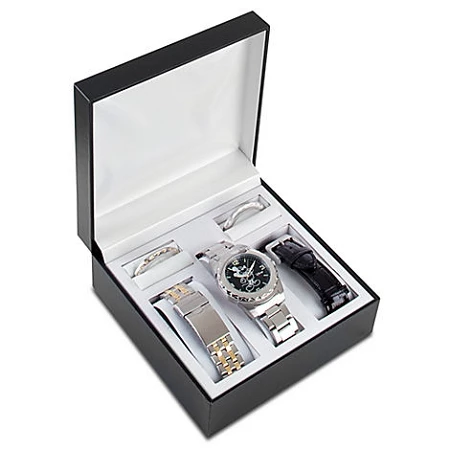 - Includes 3 bands: woven silver and gold tone, sporty brushed and stainless links and embossed black leather