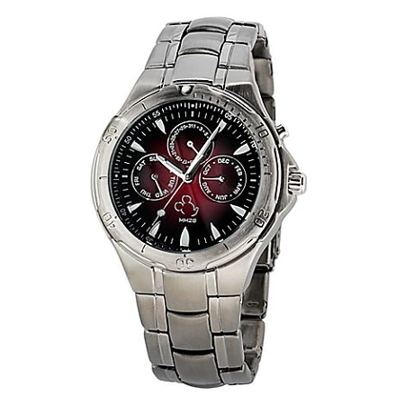 Make a futuristic fashion statement wearing Mickey’s bold metal timepiece with chronograph features. Deep burgundy face tracks month, day and time under the watch of a subtle Mickey icon.