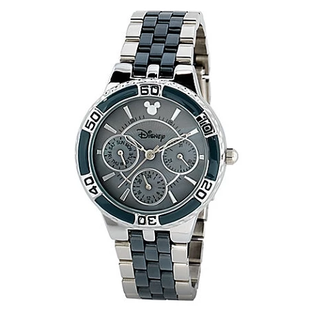 Make a futuristic fashion statement wearing Mickey’s bold metallic timepiece with chronograph features. Deep gray face tracks month, day and time under the watch of a subtle Mickey icon.