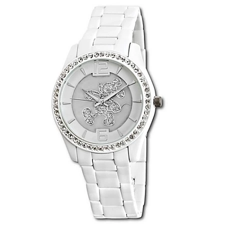 Mickey Mouse marches into your heart with our pavé crystal watch. The bezel sparkles with crystals and the opalescent face gleams. With a stainless steel caseback, Japan movement and illuminated hands, it will light up any day.